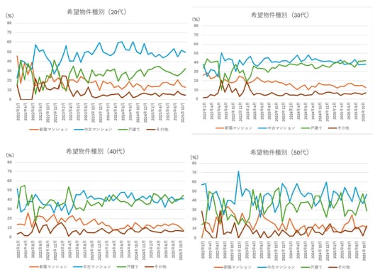 希望する物件種別を年代別に調査しました。20代は中古マンションの比率が高い状態が続いています。部屋数が必要ではなく、利便性や売却のしやすさから選ばれているものと考えられます。一方、30代以降は戸建てニーズも多くなっています。家族が増え、郊外に広い家を求める動きがあるものと考えられます。なお、新築マンションのニーズはどの年代も、年々低下傾向が見られます。価格高騰や供給戸数の減少が原因と考えられます。