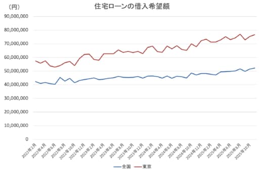 不動産価格の高騰を受け、住宅ローンの借入希望額は増加の一途を辿っています。特に東京都では、平均借入額が8,000万円近くになっています。高市政権は金融緩和的な政策を取るものと考えられ、今後も不動産価格は上昇する可能性が高く、それに合わせて借入希望額も増えるものと考えています。