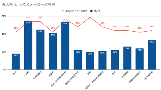 診療科別の導入率と上位3メーカー占有率から見える特徴