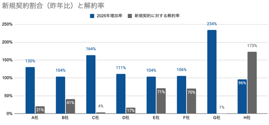 2025年に導入のあった医療機関を調査したところ、リプレイス(乗り換え)による導入が大幅に増加し、さらにシステム移行やサービス終了に伴う解約も確認されました。成長企業が躍進する一方で、減少・停滞する企業との差が拡大し、競争はより激化しています。