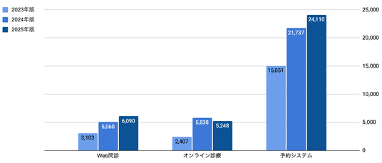 リプレイス急増で揺れるWeb問診・オンライン診療・予約システムを3年分データで分析。新規導入施設の傾向、診療科別・地域別の導入傾向を可視化したデータセットと無償ホワイトペーパーを公開。