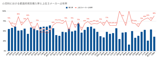 小児科における都道府県別導入率と上位3位メーカー専有率