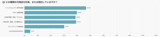 インフルエンサーPRを依頼・検討する際に、どの種類の代理店を選ぶかを尋ねたところ、最も多かったのは「インフルエンサー専門代理店」で 46.8% に達しました。
