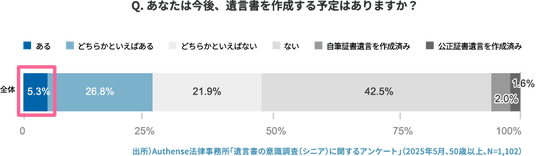 「あなたは今後、遺言書を作成する予定はありますか?」との問いに対し、明確に「ある」と回答したのは5.3%にとどまり、約20人に1人の割合。作成に至るまでには大きな心理的ハードルが存在していることがわかります。