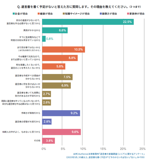 遺言書を「作成する予定はない」「どちらかといえばない」と回答した709名に理由を聞いたところ、最も多かったのは「自分の遺産が少ないので、作る必要がないと思うから(22.5%)」でした。