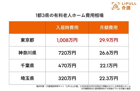 - 東京都の有料老人ホーム入居時費用相場は1,008万円と1都3県の中でも突出して高額に