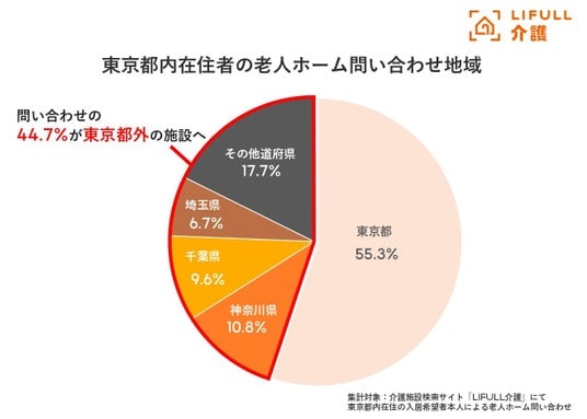 東京都内在住の老人ホーム入居希望者による施設問い合わせエリアを見たところ、東京都内の施設の割合は55.3%にとどまり、東京都以外のエリアの合計が44.7%と4割強を占めることが明らかになりました。