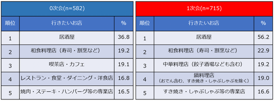 └0次会(1次会の前に軽く集まる会)~2次会は全て「居酒屋」が1位。「和食料理店(寿司・割烹など)」は0次会・1次会の両方で2位、「中華料理店(餃子酒場なども含む)」は1次会で3位に。「喫茶店・カフェ」は0次会で3位、2次会で5位