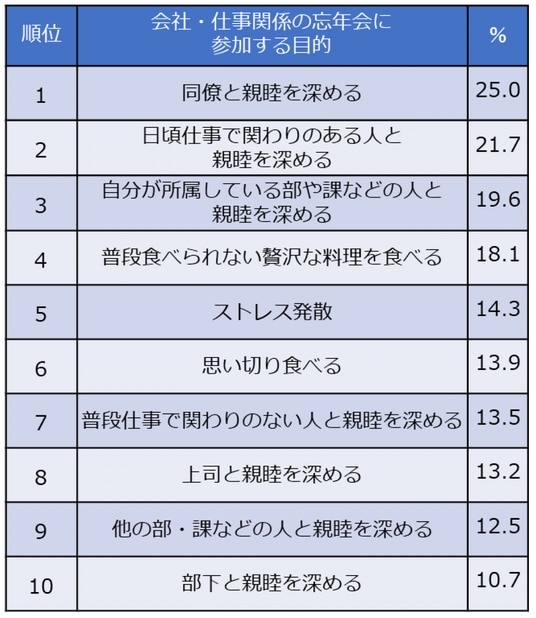 「会社・仕事関係の忘年会に参加する目的はなんですか?」という質問では、「同僚と親睦を深める」(25.0%)が1位でした。そのほか「日頃仕事で関わりのある人と親睦を深める」(21.7%)は2位、「自分が所属している部や課などの人との親睦を深める」(19.6%)が3位と社内での親睦を深める目的がトップ3を占め、7位~10位にも同様の目的がランクインしました。一方で4位には「普段食べられない贅沢な料理を食べる」、6位には「思い切り食べる」が入っており、料理目当ての一面もありそうです。
