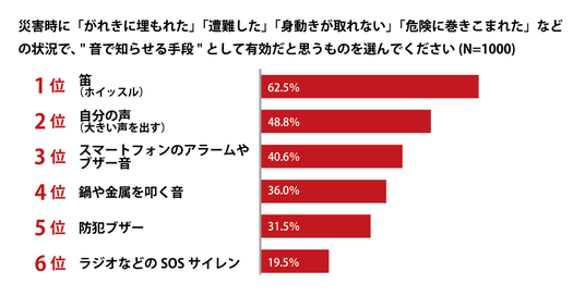 災害時に“音で知らせる手段”として何が有効かを尋ねたところ、「ホイッスル(62.5%)」が最も高く評価されていました。大声(48.8%)やスマートフォンのアラーム(40.6%)よりも信頼されており、ホイッスルは最も有効な手段として位置づけられています。
