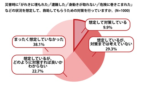 “音の出るもの”の準備率(17.1%)が最も低かった背景には、対策方法がわからないなど、災害時に自分が助けを求める状況を思い描くことそのものが難しいという課題が見えてきます。実際「がれきに埋もれる」「身動きが取れない」など状況を想定して具体的な対策を行っている人は 9.9% にとどまりました。