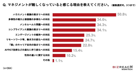 マネジメントが難しくなっていると感じる理由の上位3つは、「ハラスメント意識の高まりへの対応(50.8%)」、次いで「多様性の増大と価値観の多様化への対応(34.6%)」「メンタルヘルス問題への対応(34.3%)」でした。多様な個人に向き合う必要性の高まりが、マネジメントを難しくする要因になっていると考えられます。