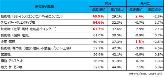 転職後に年収増加した個人が多かった職種は、「技術職(SE・インフラエンジニア・Webエンジニア)」(69.9%)、次いで「クリエイター・クリエイティブ職」(64.6%)、そして「技術職(化学・素材・化粧品・トイレタリー)」(61.7%)が続きました。