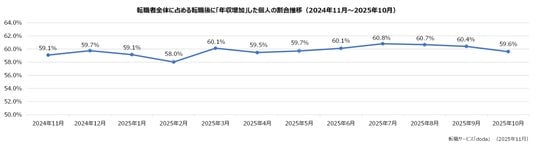 転職後に「年収増加」した個人の割合は、59.6%(前月差:-0.8ポイント)でした。