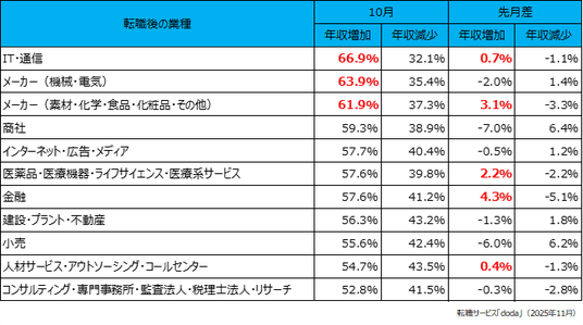 転職後に年収増加した個人が多かった業種は、「IT・通信」(66.9%)、次いで「メーカー(機械・電気)」(63.9%)、そして「メーカー(素材・化学・食品・化粧品・その他)」(61.9%)が続きました。
