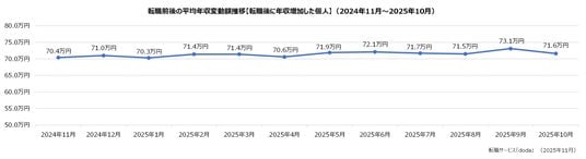 パーソルキャリア株式会社が運営する転職サービス「doda(デューダ)」(編集長:桜井 貴史)は、dodaエージェントサービスを利用して2025年10月に転職決定した個人の、転職前後の平均年収変動額と年収変動割合を発表いたします。