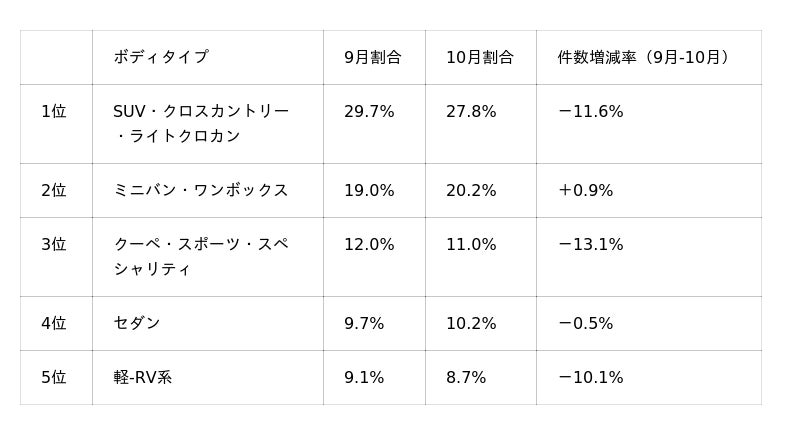 9月に好調だったクーペ・スポーツ系やSUV・クロスカントリー系、軽-RV系は前月の反動からか減少に転じました。高需要セグメントであるミニバン・ワンボックスやセダンはほぼ横ばいで推移しており、安定した需要が継続していると見られます。