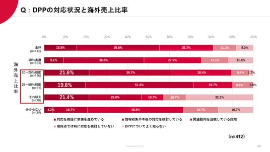 - 海外売上比率10%未満の企業に比べ、海外売上比率10%超の企業は「対応を前提に準備を進めている」の割合が高くなる傾向が見られた。一定の海外取引がある企業ほど、対応に積極的であることが示唆される