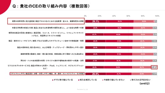 - 取り組みの1位は「資源の効率利用と投入量削減:省資源・省エネ、廃棄物発生の抑制(29.1%)」。続いて、「リサイクルしやすい製品設計(28.9%)」となった