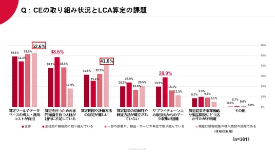 - 「情報収集層(現在は情報収集や導入検討の段階)」では、「算定ツールやデータベースの導入・運用コストが負担(52.6%)」や「算定範囲や評価方法の決定が難しい(41.0%)」が上位となり、導入初期の進め方や費用に関する課題が中心