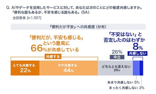 ●約3人に2人(66%)が「便利だが不安」と回答。利便性を享受する一方、潜在的なリスクが懸念利用者が多い一方で、AIの普及が必ずしも好意的に受け止められているわけではなく、約66%が「便利だが不安」と回答しています。利便性を享受する一方で、潜在的なリスクに不安や不信感を抱く人が多い実態が浮き彫りになっています。