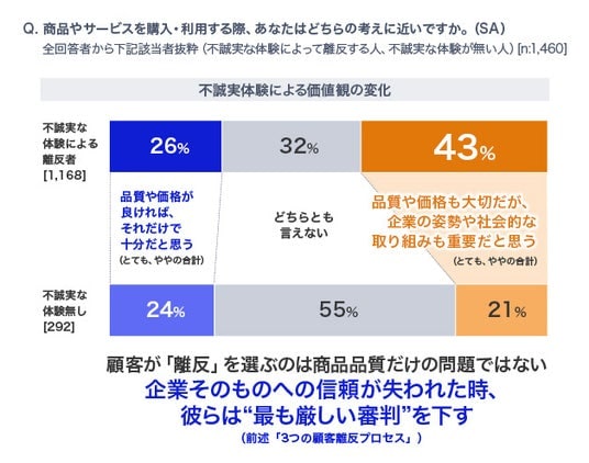 ●商品品質はもはや前提。顧客は、企業の姿勢や社会的な取り組みが信頼に足るかもジャッジ商品品質だけでなく、企業そのものへの信頼が重視されるようになり、企業の姿勢や発信内容をより厳しく評価する価値観が生まれています。その経験がブランドへの信頼低下や購買離反など、顧客行動に大きな影響を与えています。