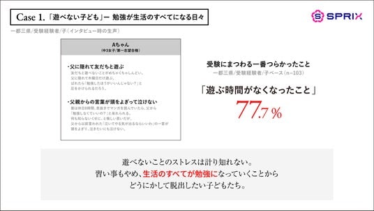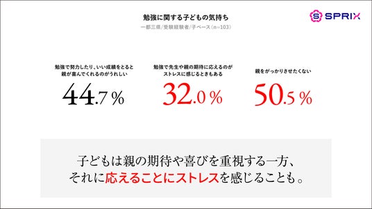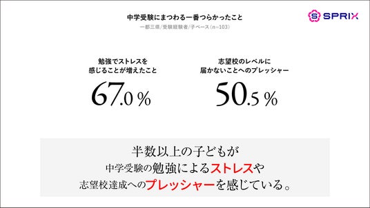 株式会社スプリックス(本社:東京都渋谷区/代表取締役社長:常石博之、以下「SPRIX」)は、「中学受験に関する調査」を実施し、中学受験(=中受)が子ども・親に与える影響を定量・定性調査で明らかにしました。