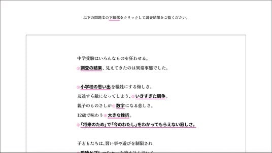 スクロールすると「中学受験」に関する問題文が出現。下線部をクリックすると、調査結果を元にした中学受験の課題や受験当事者の子どもの本音(アンケートの回答)が表示されます。