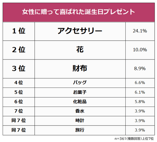 女性に贈って喜ばれた誕生日プレゼントの圧倒的1位は「アクセサリー(24.1%)」でした。2位「花(10.0%)」、3位「財布(8.9%)」が続きます。
