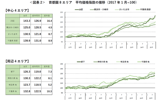 なお、東京都(23区/都下)、神奈川県(横浜市・川崎市/他)、埼玉県(さいたま市/他)、千葉県西部の7エリアは2017年1月以降最高額を更新した。