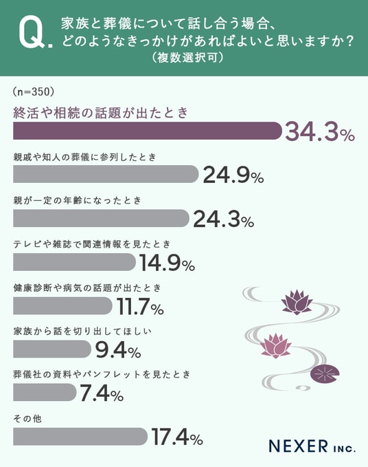 家族と葬儀の話を始めるきっかけとして最も多かったのは「終活や相続の話題が出たとき」でした。