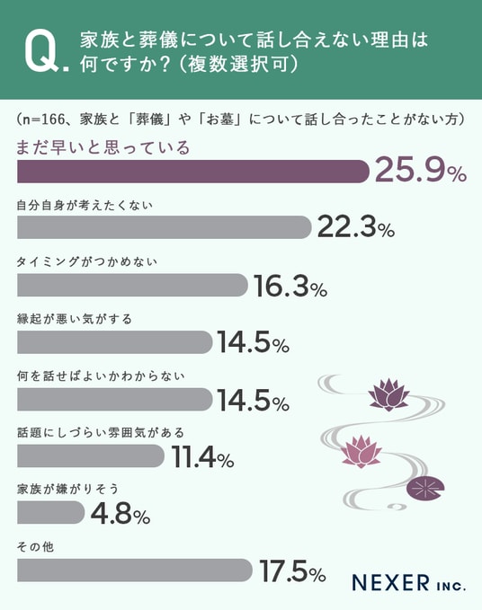 家族と葬儀について話し合えない理由として最も多かったのは「まだ早いと思っている」でした。