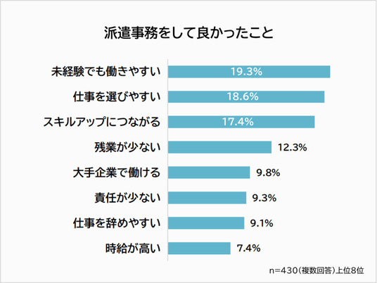 「派遣事務をして良かったこと」を聞いたところ、1位は「未経験でも働きやすい(19.3%)」です。