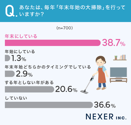 大掃除を「年末にしている」方は約4割ですが、「していない」方も約37%と大きな割合を占め、大掃除が国民的な習慣ではなくなりつつある現状を示しています。