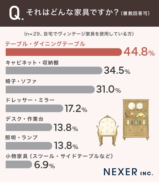 ■44.8%が、自宅で使用しているヴィンテージ家具は「テーブル・ダイニングテーブル」