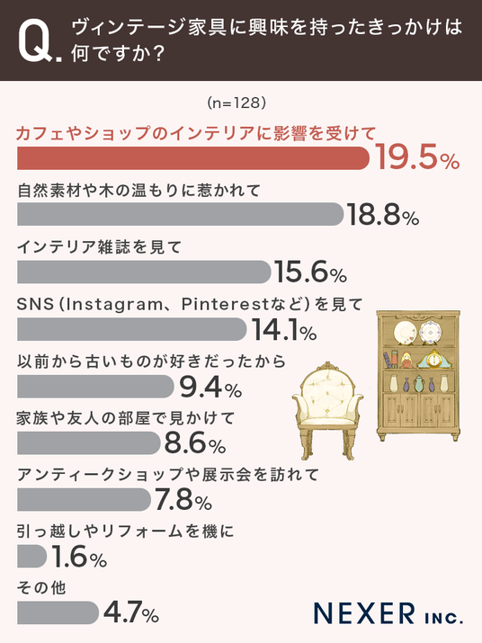 ■19.5%が、ヴィンテージ家具に興味を持ったのは「カフェやショップのインテリアに影響を受けて」