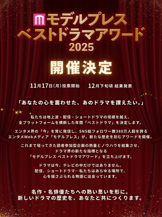 株式会社ネットネイティブ(本社:東京都品川区、代表取締役社長:松下佳憲)が運営する日本最大級の女性向けエンタメ&ライフスタイルニュースサイト『モデルプレス』は、全プラットフォームを横断した年間「ベストドラマ」を決定するアワード「モデルプレス ベストドラマアワード2025」を開催します。