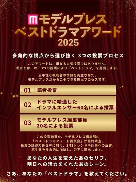 この投票結果を、モデルプレス編集部内「ベストドラマアワード委員会」が最終精査。投票の説得力ある声に加え、SNSトレンドや記事への反響、再生数を多角的に加味し、公平に選出します。