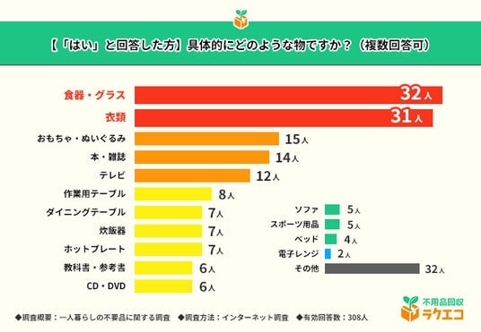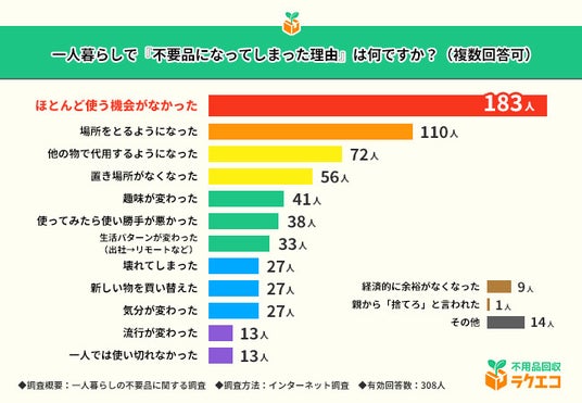 不用品回収ラクエコ(所在地:静岡県浜松市東区、事業責任者:氏原 雄一郎)は、一人暮らしで不要なものがある308名を対象に、一人暮らしの不要品に関する調査を実施しました。