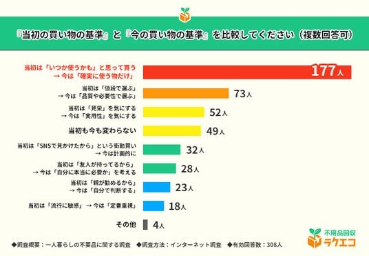 そこで、次に「『当初の買い物の基準』と『今の買い物の基準』を比較してください(複数回答可)」と質問したところ、『当初は「いつか使うかも」と思って買う→今は「確実に使う物だけ」』(177人)が堂々の1位を獲得。2位は『当初は「値段で選ぶ」→今は「品質や必要性で選ぶ」』(73人)、3位は『当初は「見栄」を気にする→今は「実用性」を気にする』(52人)となりました。