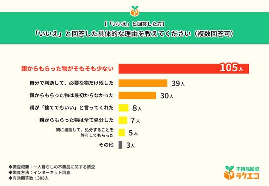 すると、『親からもらった物がそもそも少ない』(105人)が最も多い結果となりました。続いて『自分で判断して、必要な物だけ残した』(39人)、『親からもらった物は最初からなかった』(30人)となっています。