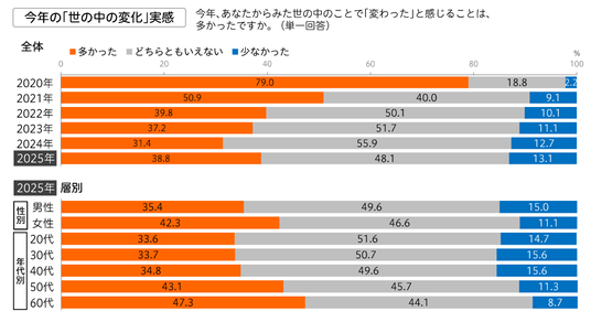 - 今年の「世の中の変化」実感は、「多かった」が38.8%で、前回(31.4%)より+7.4ptと前年までの減少傾向から転じて増加しています。また、「どちらともいえない」は48.1%で前回(55.9%)から減少(-7.8pt)し、「少なかった」は13.1%で、前回(12.7%)から微増(+0.4pt)しました。