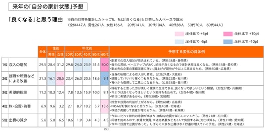 - 来年の家計予想の理由(自由回答)を集計したところ、「悪くなる」と思う理由では「物価上昇による出費増加」(49.3%)、「収入の減少」(31.9%)、「良くなる」と思う理由では「収入の増加」(29.5%)、「就職や転職などによる改善」(21.3%)がそれぞれ上位となっています。収入増の期待はあるものの、現実には「収入は据え置きのまま、物価だけが上がる」といった嘆きの声が多くみられます。