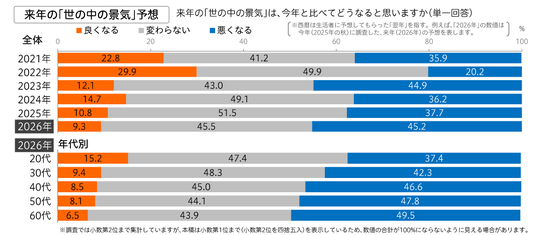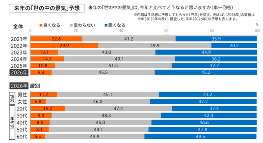 博報堂生活総合研究所は、2015年から毎年秋に、翌年の景況感などについて全国の20~69歳男女3,900人に予想してもらう調査を実施しています。このたび最新の調査を加え、“2026年 生活気分”としてまとめました。※10月2-6日に調査