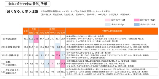 - 来年の景気予想の理由(自由回答)を集計すると、「悪くなる」と思う理由では「物価上昇の継続・加速」(55.0%)、「良くなる」と思う理由では「希望的観測」(23.5%)がトップとなりました。いずれも女性を中心に高いスコアとなっており、前回に引き続き景気の好転に期待する一方、物価の上昇がそれ以上に重くのしかかり、来年の景気を悲観的に考える生活者が多いようです。