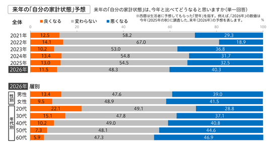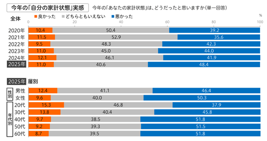 - 今年の「自分の家計状態」実感は、「良かった」が11.0%(前回:12.1%)、「悪かった」が48.4%(前回:41.9%)と、前回から悪化しました。