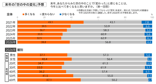 - 来年の「世の中の変化」予想は、「多くなる」が38.8%と、前回(32.5%)より+6.3ptと増加し、こちらも前年までの減少傾向から転じて増加となっています。