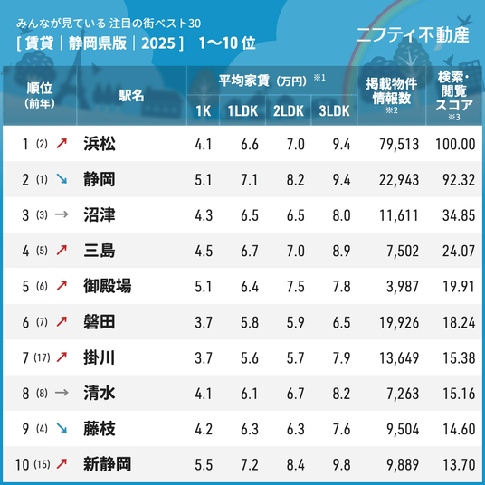 今回は、静岡県で賃貸物件を探しているユーザーからの注目を集めた街ランキング(ベスト30・2025年)を発表いたします。