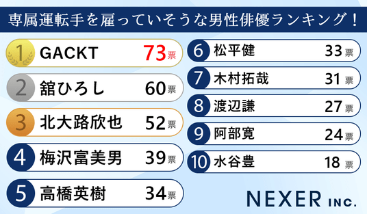 専属運転手を雇っていそうな男性俳優ランキングでは、1位にGACKTさん、2位に舘ひろしさん、3位に北大路欣也さんが選ばれました。