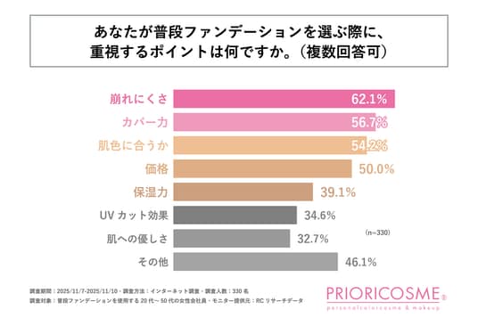 20代~50代の女性会社員が、ファンデーションを選ぶ際に重視するポイントのトップ3は、1位「崩れにくさ」、2位「カバー力」、3位「肌色に合うこと」